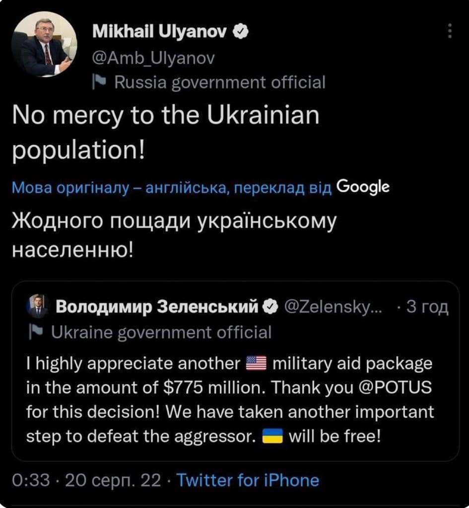 Der ständige Vertreter der Russischen Föderation bei internationalen Organisationen in Wien (Österreich), Mikhail Ulyanov, hatte als Antwort auf den Dankposten des Präsidenten der Ukraine, Wolodymyr Selenskyj, für das neue Paket der Militärhilfe der Vereinigten Staaten den Aufruf getwittert, die ukrainische Bevölkerung nicht zu verschonen. Später löschte Ulyanov seinen Tweet.