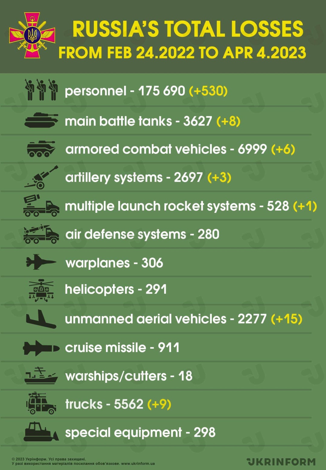Die Streitkräfte der Ukraine zerstörten außerdem 3.627 (+8 am vergangenen Tag) Kampfpanzer, 6.999 (+6) gepanzerte Kampffahrzeuge, 2.697 (+3) Artilleriesysteme, 528 (+1) Mehrfachraketenwerfer, 280 (+0) Luftabwehrsysteme, 306 (+0) Flugzeuge, 291 (+0) Hubschrauber, 5.562 (+9) Kraftfahrzeuge und Tanks mit Treib- und Schmierstoffen, 18 (+0) Schiffe/Boote, 2.277 (+15) Drohnen, 298 (+0) spezielle Fahrzeuge. 911 (+0) Marschflugkörper wurden abgeschossen.