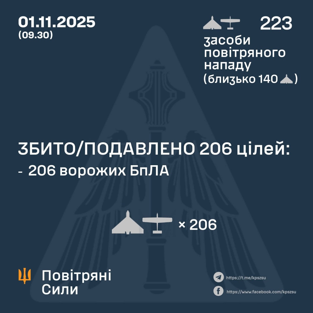 Vorläufigen Angaben zufolge wurden 206 Kampfdrohnen in den nördlichen, südlichen und östlichen Regionen der Ukraine abgeschossen oder unschädlich gemacht – Stand 09:30 Uhr, Samstag, 1. November.