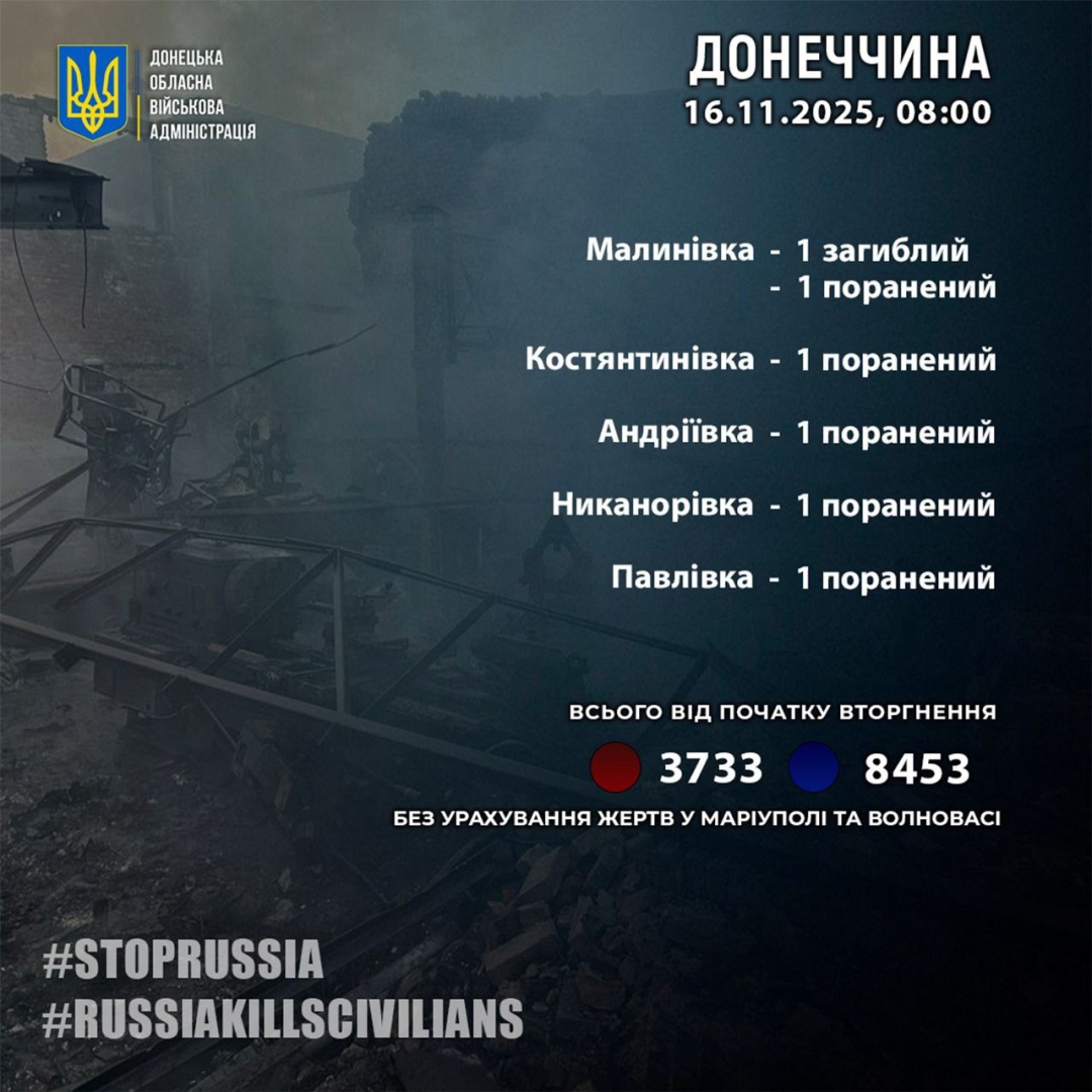 „Russland tötet Zivilisten! Am 15. November haben die Russen einen Zivilisten in der Region Donezk getötet: in Malyniwka. Noch fünf Zivilisten sind gestern verletzt worden: 1 - in Malyniwka, 1 - in Kostjantyniwka, 1 – in Andrijiwka, 1 – in Nykanoriwka und 1 - in Pawliwka“, teilte der Gebietsgouverneur mit.