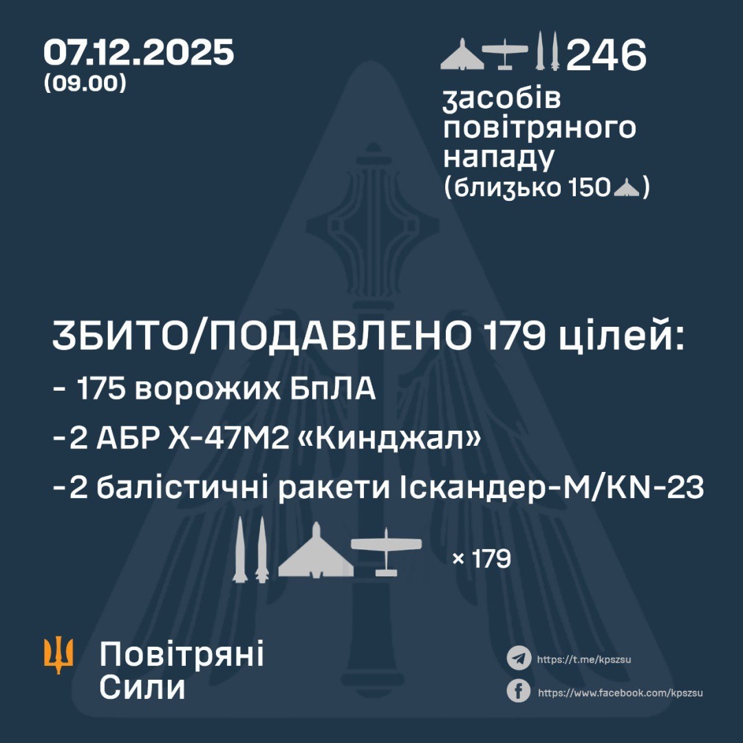 Mit Stand 09:00 Uhr, Sonntag, 7. Dezember hat die Luftabwehr 179 Luftziele abgeschossen/neutralisiert: 175 feindliche Drohnen vom Typ Shahed, Gerbera und Drohnen vom anderen Typ, zwei Hyperschallraketenvom Typ Kh-47/M2-Kinschal, zwei ballistische Iskander-M/KN23-Raketen.