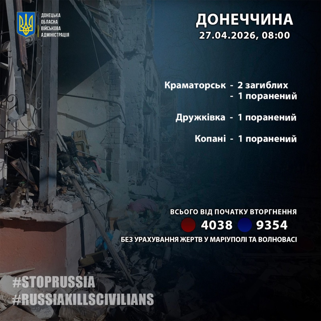 Die Stadt Kramatorsk wurde am 26. April mit drei FAB-500-Bomben angegriffen. Eine Frau (1976) und ein Mann (1981) kamen ums Leben. Ein 50-Jähriger wurde verletzt.