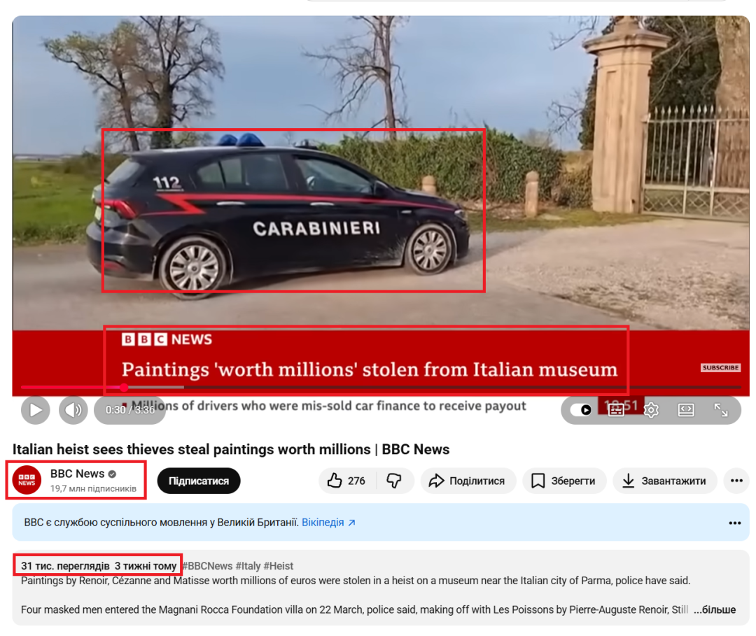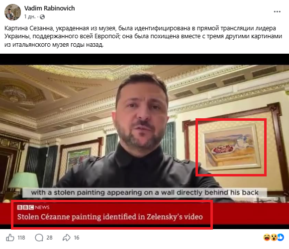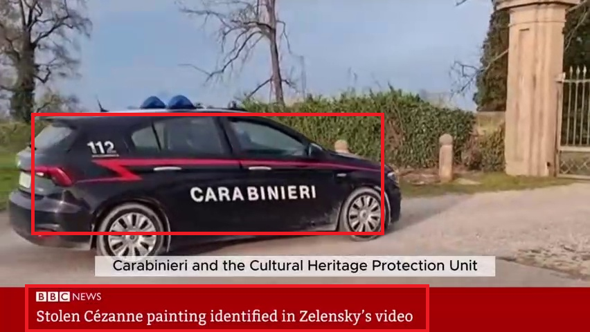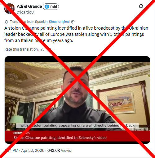 Russische Nachrichtenseiten, Telegram-Kanäle und Bots auf X und Facebook verbreiten ein Video mit dem BBC-News-Logo. Darin wird behauptet, während einer Videoansprache des ukrainischen Präsidenten Wolodymyr Selenskyj vom 16. April 2026 sei ein Gemälde des französischen Künstlers Paul Cézanne gesehen worden, das am 30. März aus dem Museum der Magnani-Rocca-Stiftung bei Parma in Italien gestohlen worden sei. Die Nachricht wurde international vielfach geteilt. Insbesondere ein prorussischer spanischsprachiger Kanal auf X veröffentlichte einen Screenshot des Gemäldes, der über 600.000 Klicks hatte. Das Video mit dieser „Nachricht“ wurde auch in chinesischen sozialen Netzwerken geteilt.