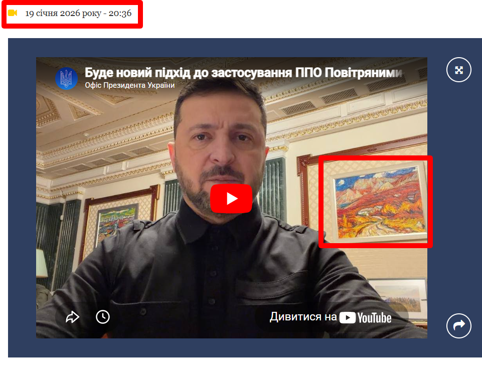 Um die Fälschung zu erstellen, manipulierten die Russen zudem ein Video mit einer Ansprache des ukrainischen Präsidenten. Hierfür verwendeten sie ein Video vom 19. Januar 2026. Im Originalvideo hängt ein anderes Gemälde an der Wand – ein Werk des Krim-Künstlers Andrij Tschebotar.