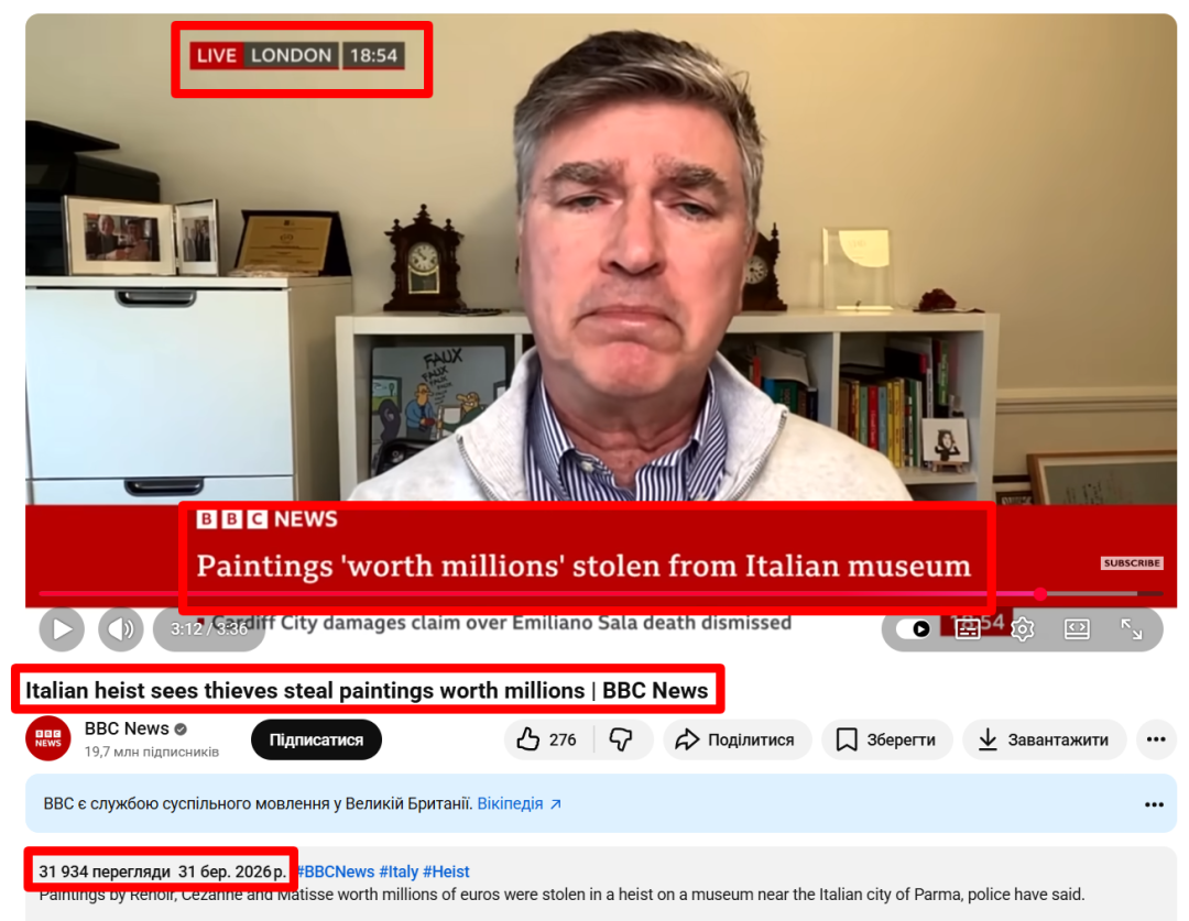 Das ist ein Fake. Mithilfe von Grafikprogrammen haben Propagandisten die Originalsendung der BBC News vom 31. März 2026 geändert. Sie entfernten einige Details zum Raubüberfall sowie einen Ausschnitt mit dem Moderator im Studio. Außerdem entfernten sie komplett die Originaltonspur und ersetzten sie durch einen Text mit Thesen über Wolodymyr Selenskyjs angebliche Beteiligung an dem Raubüberfall.