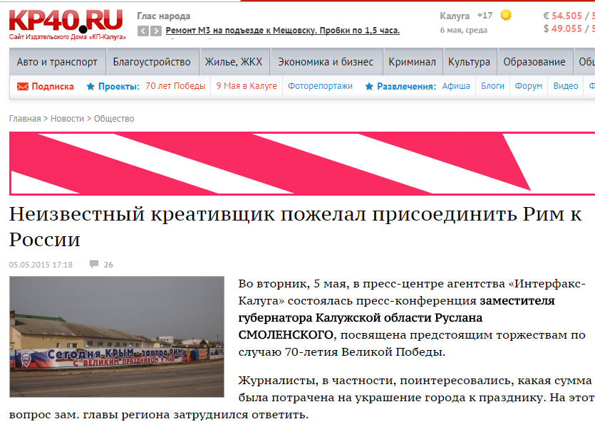 Kiew, den 06. Mai /Ukrinform/. Auf einer Straße im Zentrum der russischen Stadt Kaluga hängt ein riesiges Spruchband anlässlich des Sieges über Nazi-Deutschland. Auf dem Spruchband sind historische Schlachten aufgelistet, die Russland gewann. Darunter sind solche Schlachten wie im Kursker Bogen, aber auch die Schlacht bei Debalzewe 2015. Die größte Anschrift lautet aber: „Heute Krim, morgen Rom“, berichtet der russische Radiosender „Echo Moskwy“ unter Berufung auf örtliche Medien.