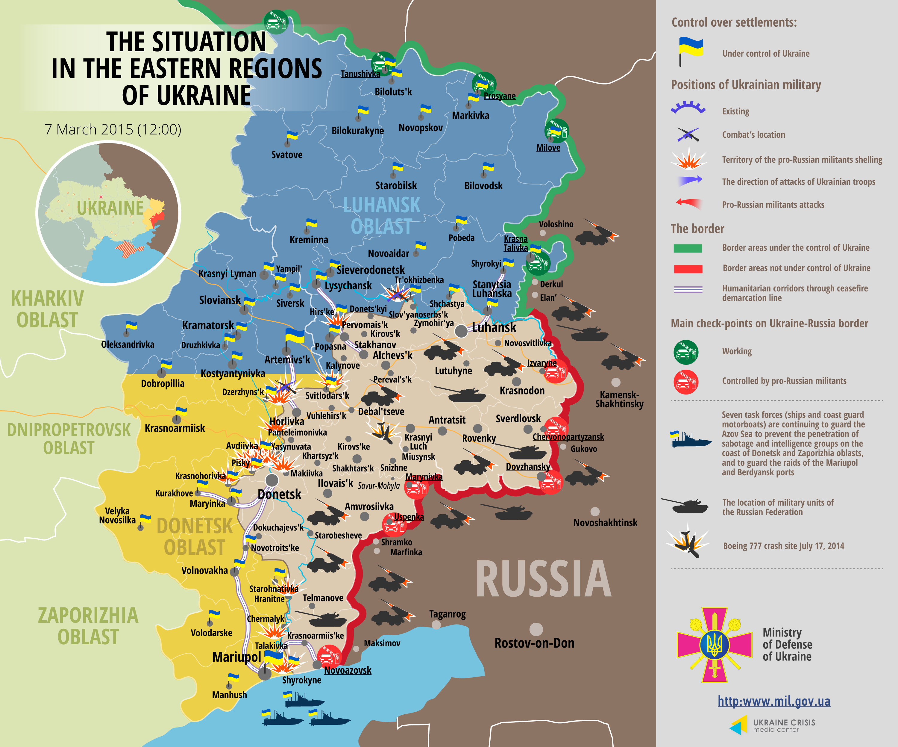 Das Informations- und Analyse-Zentrum des Nationalen Sicherheits- und Verteidigungsrates der Ukraine hat eine Karte über die Situation in der Ostukraine veröffentlicht. (Stand: 7. März 2015, 12:00 Uhr).