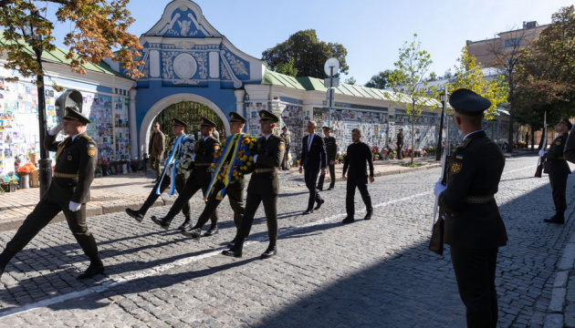 „Heute haben wir gemeinsam mit dem finnischen Präsidenten Alexander Stubb der ukrainischen Verteidiger an der Gedenkmauer in Kyjiw gedacht, die ihr Leben für die Ukraine gegeben haben“, teilte Selenskyj mit.
